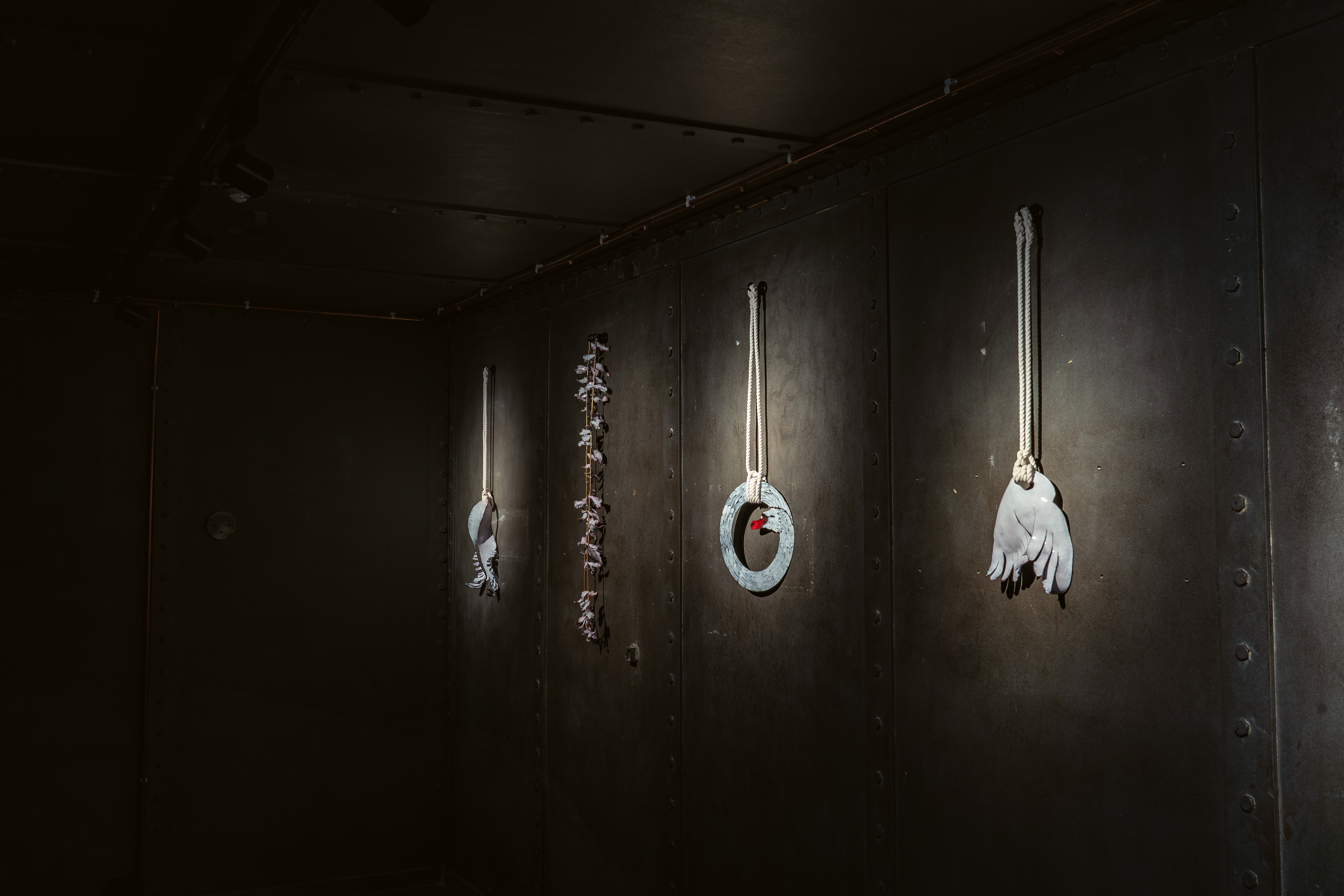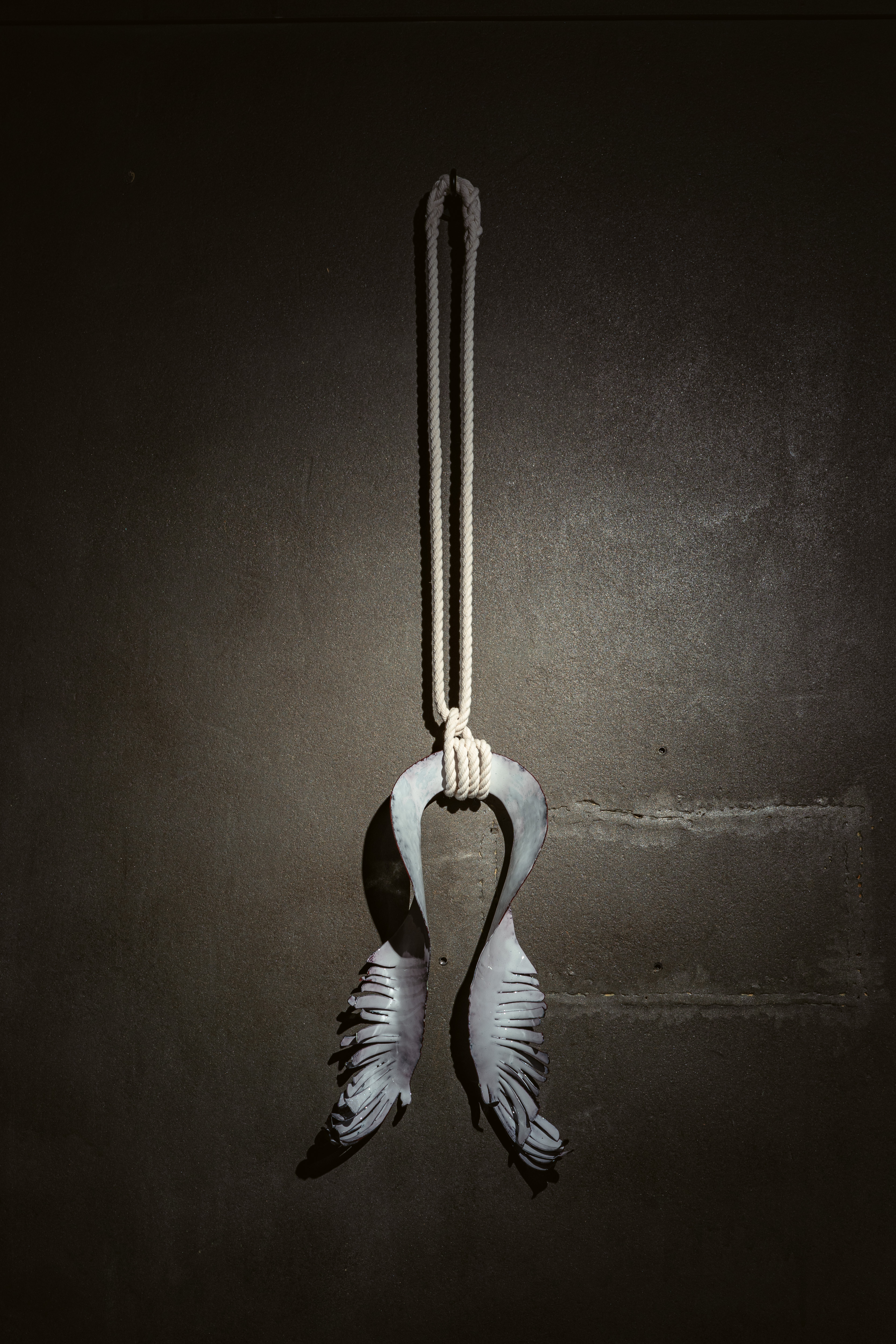 Bildet er tatt i en litt skrånende vinkel inn mot Rom 2 fra inngangspartiet. Det meste av billedflaten er mørk, dette er grunnet veggene og belysningen i rommet som er spotter rettet ned mot kunstverkene. Fra omtrent midten bakerst i bildet og mot høyre henger det fire hvite, opplyste verk, på rekke og rad. Det bakerste i bildeflaten er vanskelig å skimte, men man kan fornemme at det er et par vinger. Til høyre for dette henger det som kanskje er det mest tradisjonelle smykket i denne sammenhengen, som består av mange fjær i et sluttet kjede. I bildet fremstår de som små, hvite papirflak nesten, der det er flest i toppen. Dette er det eneste verket som ikke henger fra et hvitt tau, men mer et kjede der små rør av messing skiller fjærene fra hverandre. Til dette verkets høyre henger et sirkel-formet verk. Dette er svanens hals, som fullendes i en sirkel der hodet til svanen er i profil oppe til høyre i sirkelen. Den vender nebbet, som er rødt, inn mot midten. Flere av publikum fikk assosiasjoner til Ourobous av dette verket, også kjent som slangen som biter sin egen hale. Det siste verket lengst til høyre er også lengst fremme i billedflaten. Her er det også et par vinger som er utformet, men som følger kurven til svanens rygg mer enn det første verket, og derfor er mer buet.