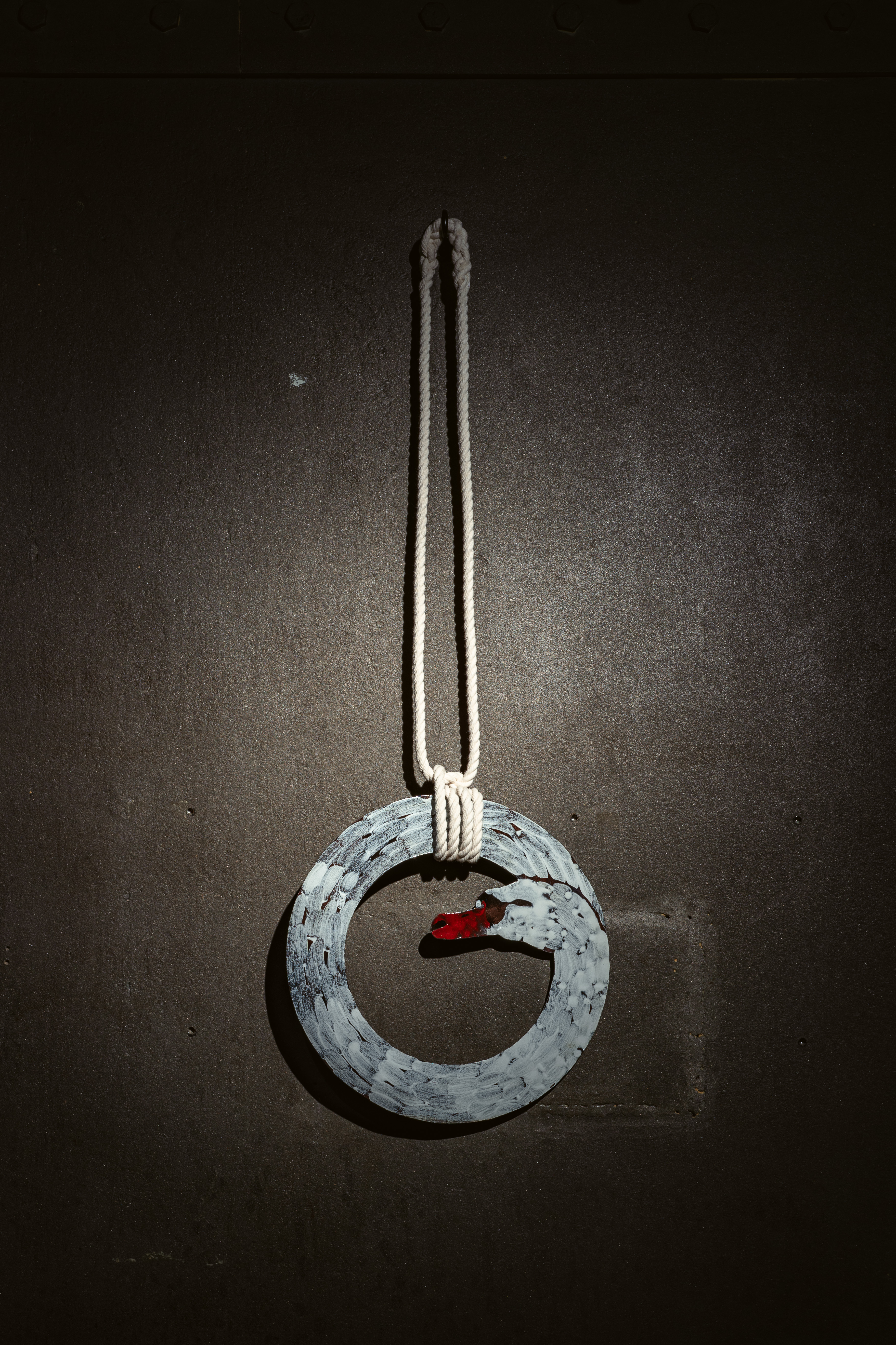 Bildet er tatt i frontalperspektiv, og er et nærbilde av det ene verket beskrevet under første bilde. Hengende fra et hvitt rep, er en svanes hals og hode skåret ut i kobber, og emaljert hvitt. Verket er en fullendt sirkel, der «begynnelsen» av halsen kamufleres av svanens hodet, som er i profil og peker med nebbet inn mot sirkelens senter. Nebbet er rødt, og det er en smal svart strek som indikerer et øye. Resten av verket er hvitt, og emaljen er påført med pensel som gjør at verket har sterke, maleriske kvaliteter. Dette skaper også en dybde i verket, da strøkene dekker kobberet i ulik grad. Dette verket har flere påpekt minner om ouroboros – slangen som spiser sin egen hale.