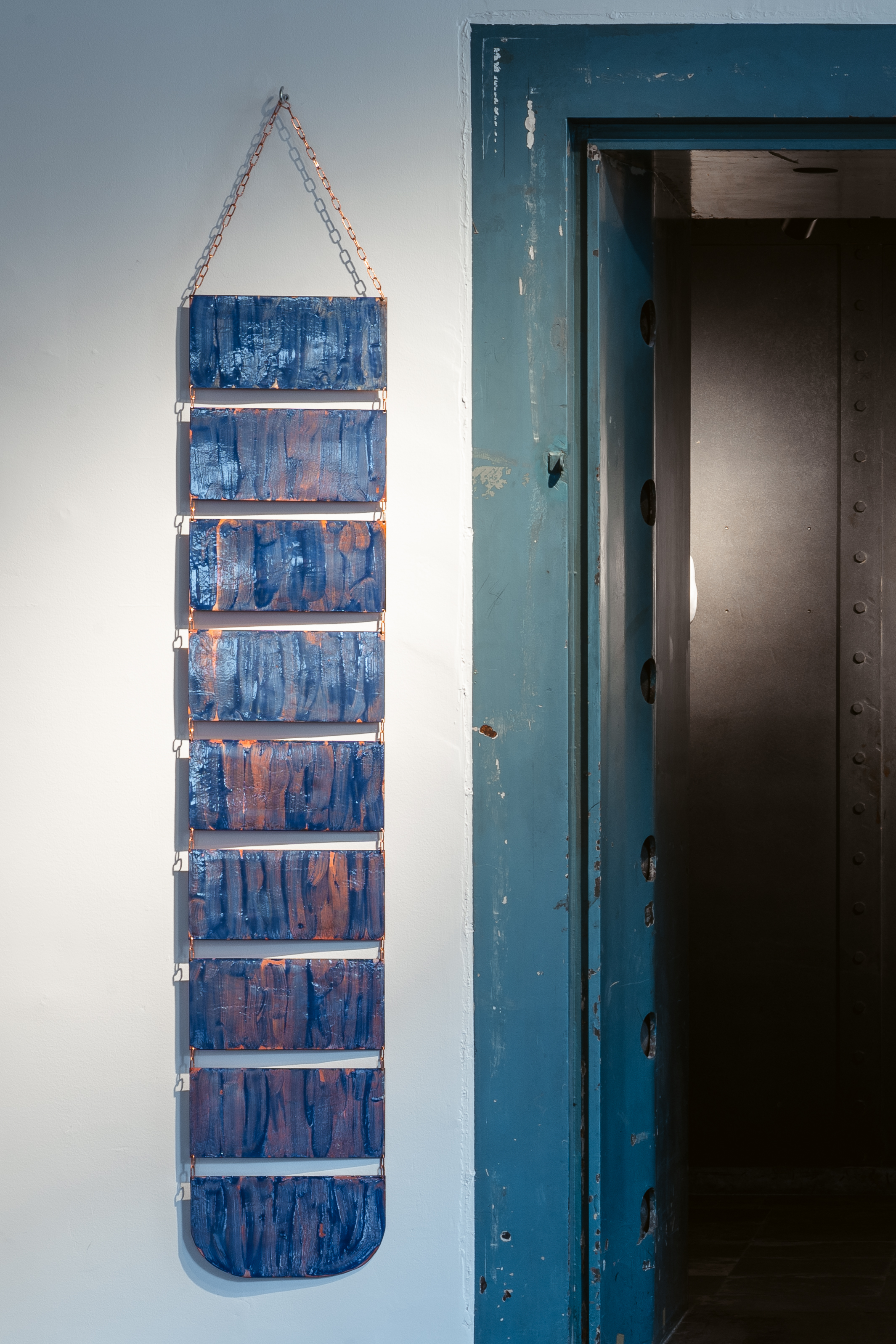 Bildet er tatt i frontalperspektiv mot kunstverket som beskrevet først under forrige bilde. Det meste av billedflaten er mørkt, med verket hengende opplyst i midten. Det består av kobber som er formet som et par vinger, der vingene spres ut mot hver side nederst. Formen kan minne om et åttetall, bare at det er åpent nederst. Verket henger fra et hvitt rep, som er spleiset sammen øverst.