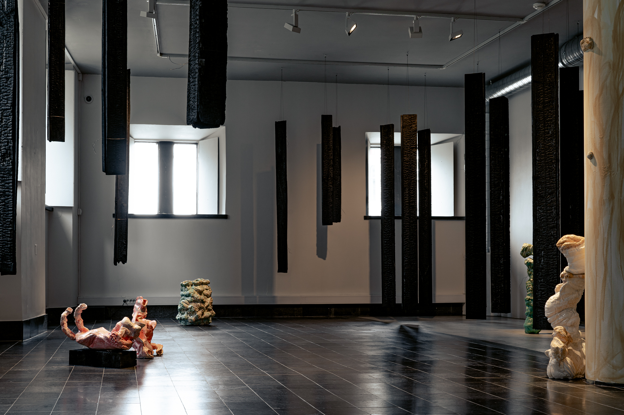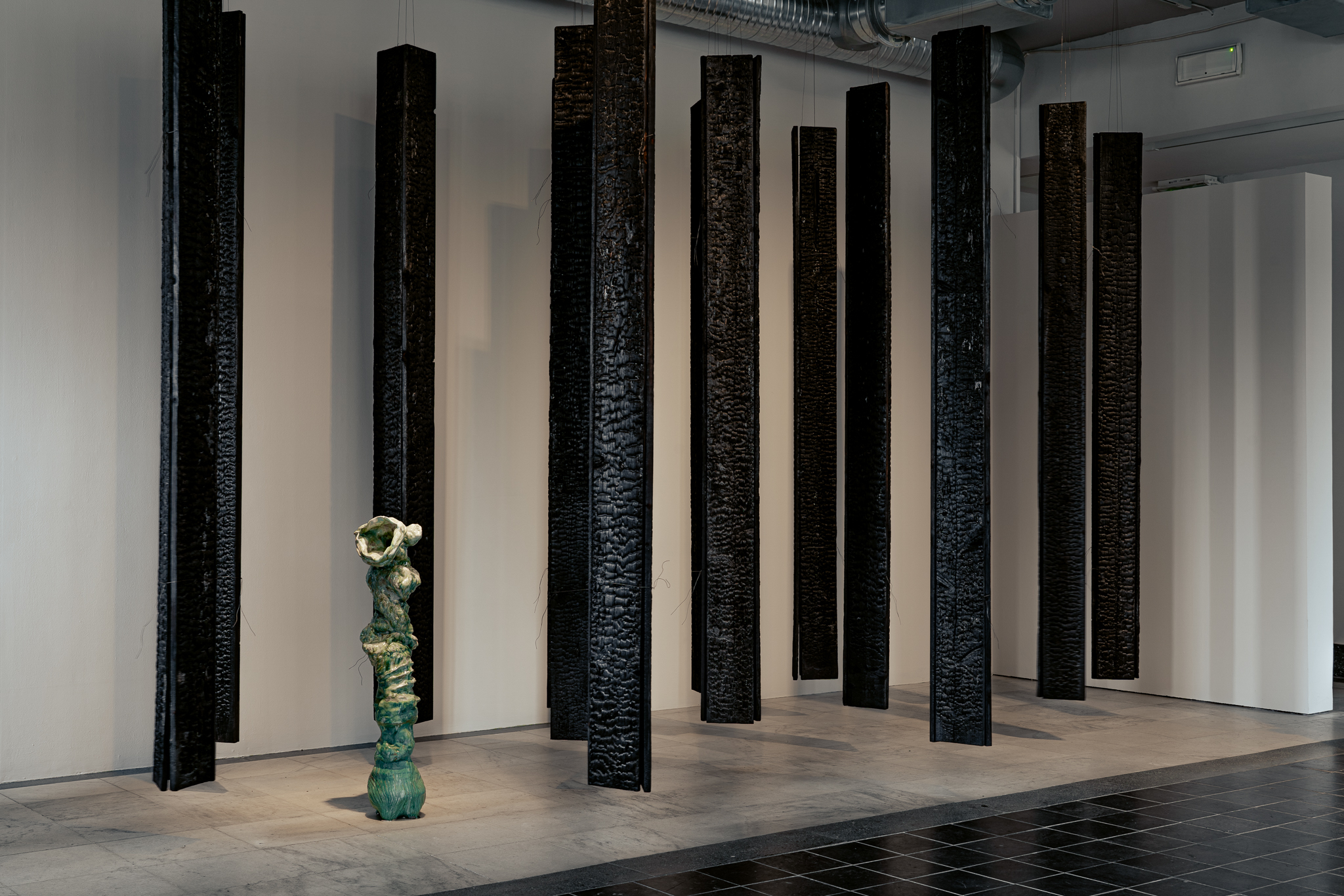 Bildet er tatt i et frontalt perspektiv fra innsiden av ROM 1 og viser to av Nordlis keramiske skulpturer samt et utsnitt fra en av plankeinstallasjonene som henger fra taket.