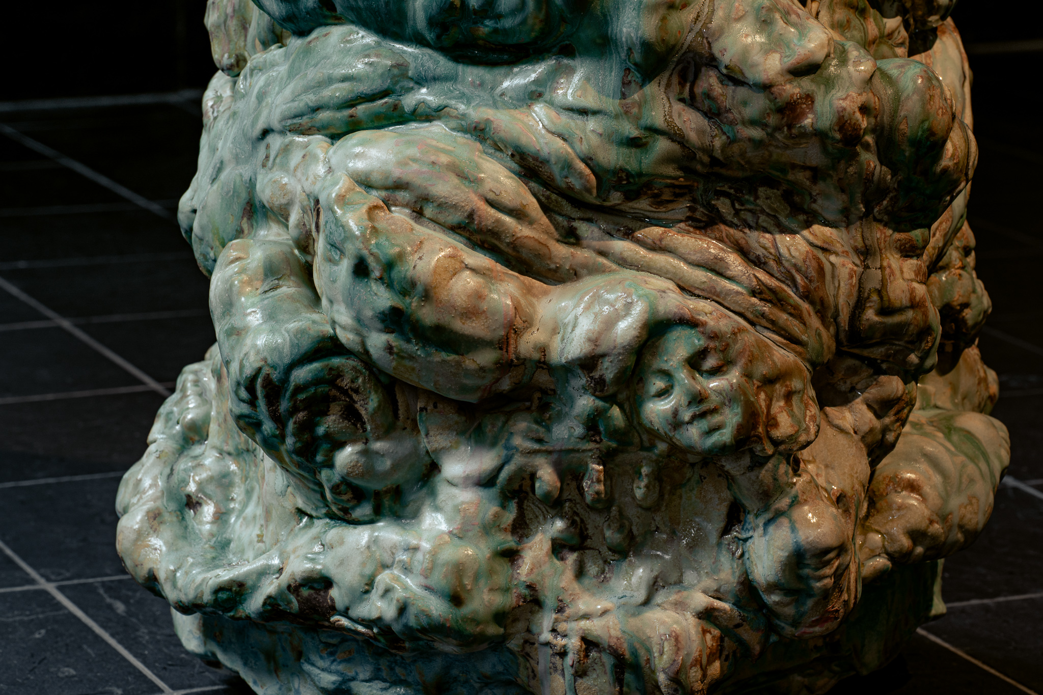 Skulpturen er overordnet formet litt som en kuppel og består av leire som er både håndbygd og støpt. Også her er det mange organiske former som bukter seg inn og ut av hverandre i bulende formasjoner, og glasuren er grønnlige, brunlige og hvite i et sammensmeltet uttrykk. Når man først møter på skulpturen tar det litt tid før man ser det, men om man gir det nok tid vil man oppdage at skulpturen består av veldig mange ansikter som kan minne om porselensdukker i størrelse og uttrykk, som dukker opp gjennomgående i ulike vinkler.
