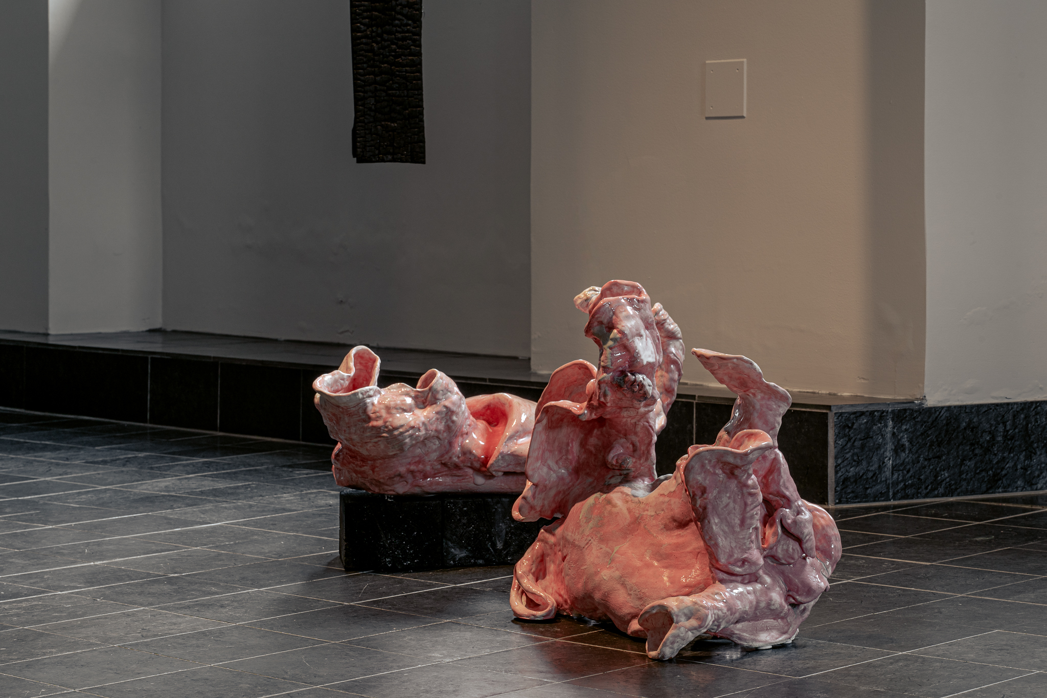 Det hvite i bildeflaten er veggene i rommet, og det sorte i nederste halvdel av bildet er de sorte flisene i gulvet. Sentrert midt i bildet er det to forskjellige skulpturer, begge håndbygget i leire. Vinkelen bildet er tatt i gjør det litt vanskelig å separere de to skulpturene fra hverandre, men den bakerste hviler ovenpå en sort blokk mens den andre fremst i bildet står direkte plassert på gulvet. Fargene i begge skulpturene er i blanda hvite og rosa nyanser, som kan minne litt om rått kjøtt. De organiske formene forsterker det litt kjøtt- eller kroppslige uttrykket, noe som gjør at man kan få assosiasjoner til dyreriket.