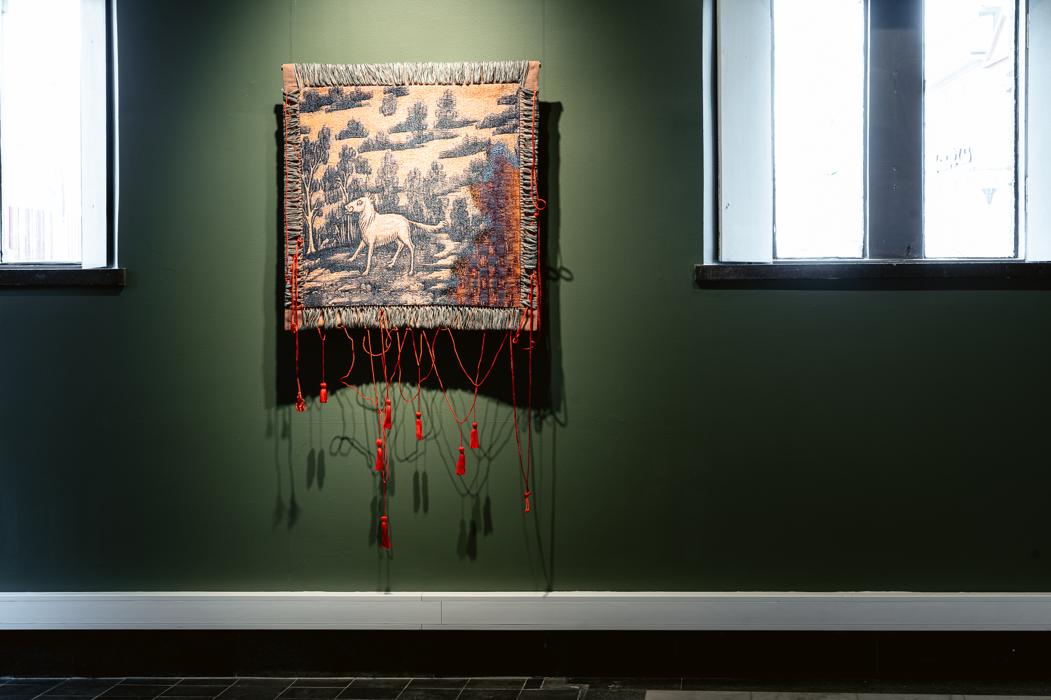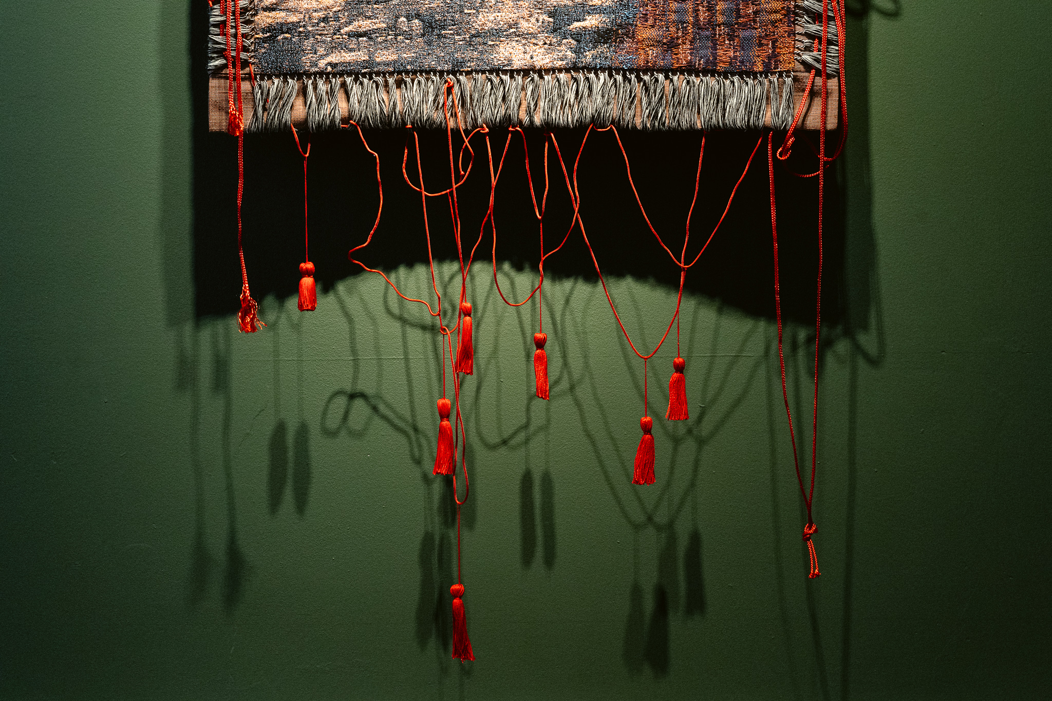 Bildet er tatt i et frontalperspektiv og er et detaljbilde av de røde frynsene beskrevet under bildet ovenfor. Det meste i billedflaten er den grønne veggen, og man kan skimte underdelen av billedveven sentrert øverst i midten. Fra venstre til høyre i bildet henger det ni knallrøde dusker fra like røde tråder, med sterke skygger bak. De henger i ulike lengder, hvor de i midten når helt ned til bunnen i bildet. I bildet ser man hvordan de røde trådene er rotete plassert, på en måte som kan minne om strekene i en barnetegning.