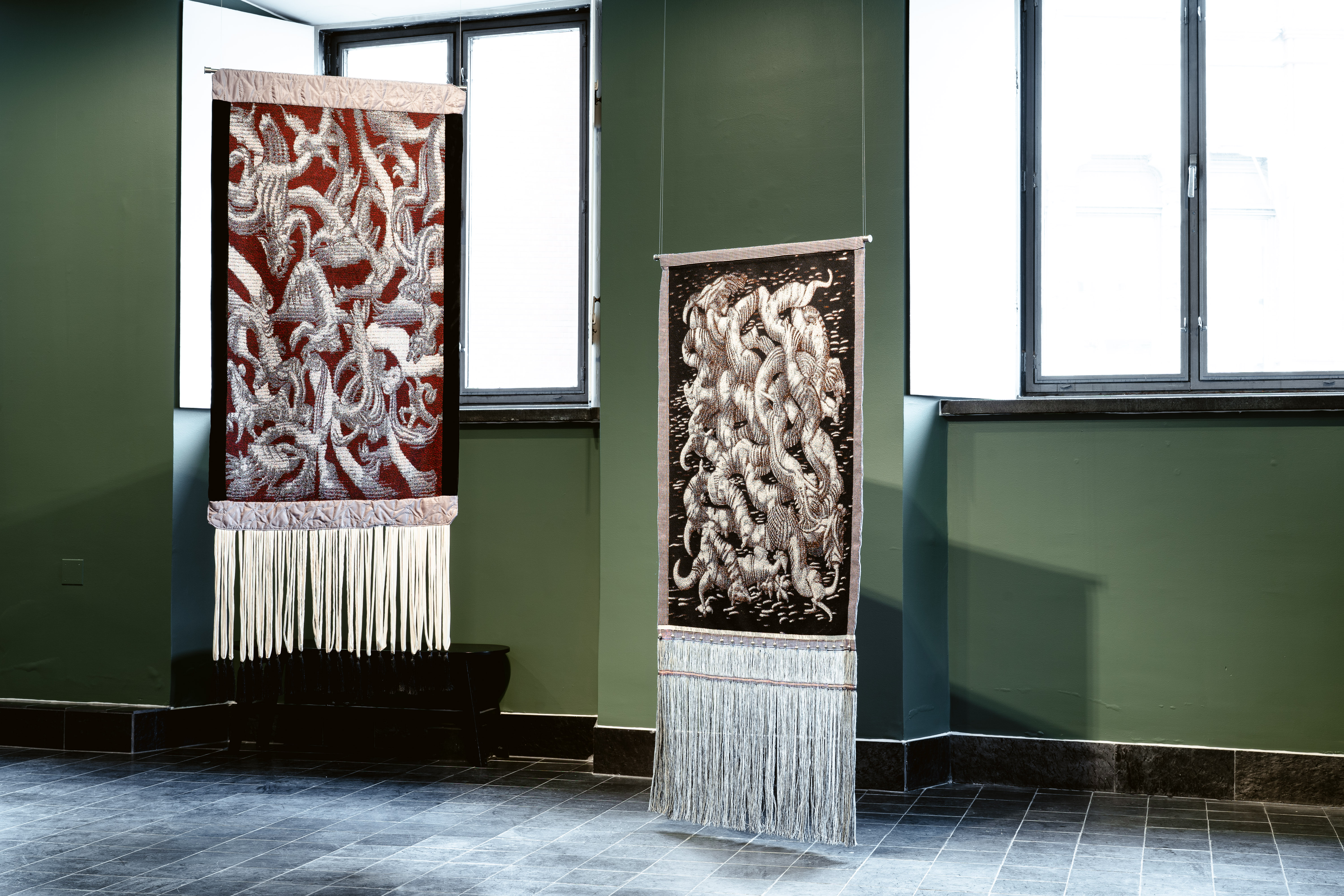 Verket til høyre har en kant som går rundt hele motivet, denne er lys og lillatonet. Hovedmotivet minner også i dette verket om middelalderske drager eller reptiler, men mer forknytte og samlet i midten av flaten enn på det forrige, ingen linjer strekker seg utover flatens grenser. Her er bakgrunnen sort, og fargene mer metalliske og sølvaktige i uttrykket. Også dette verket har frynser, disse er laget av tynnere, tekstil tråder, og går nesten helt ned på gulvet. I kanten opp mot motivet henger det små sølvkuler på rekke og rad, og ca. Fem cm under sølvkulene går det et tynt, tverrliggende bånd i samme utforming som bårdene langs hovedmotivet.