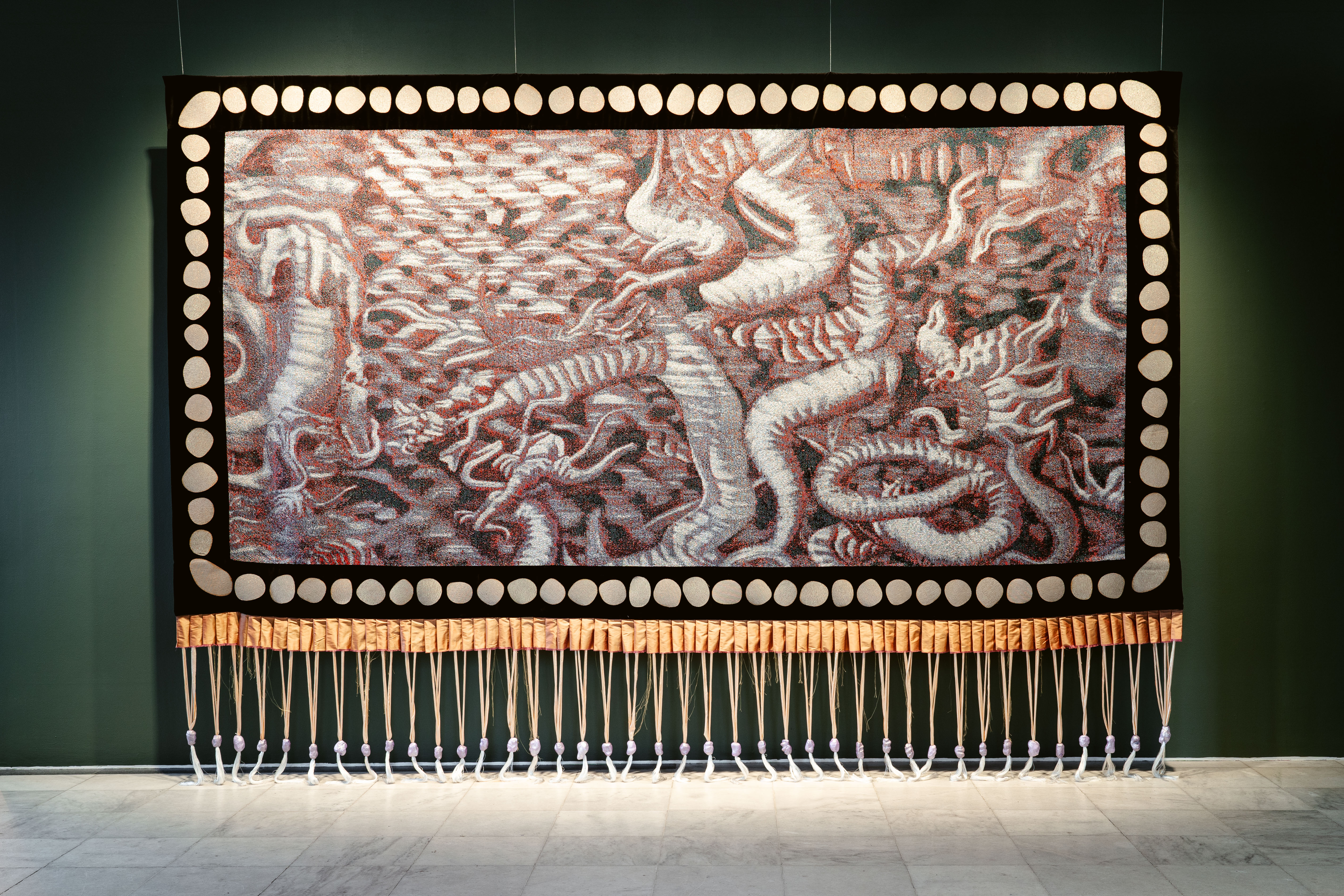 Bildet er tatt i et frontalperspektiv, og viser Rom 1 sin lengste vegg, til venstre for inngangsdøren. I bildet kan man se de hvite flisene nede i flaten, og de grønne veggene bak verket, som er opplyst og sentrert. Verket dekket nesten hele veggen, og var omtrent tre og en halv meter høyt og rundt fem meter langt. Verket er formet som en stor rektangel av tekstil, med frynser i bunnen. Hovedmotivet er vevet digitalt og kan skimtes i midten, det kan minne om en deformert drageskikkelse, som buer og bukter og går inn og ut av seg selv. Formene er både gjenkjennelige og abstrakte, nesten hallusinatoriske i sin oppbygging og mange kan minne om reptilhaler. Fargene er i røde, lilla og hvite toner, med noen punkt mer fargesterke enn andre. Rundt hele hovedmotivet går det en svart kant i velur, med sirkulære former, i en glitrende, eggehvit tone. I verkets bunn går først en kant av tekstil som er foldet i en gull eller bronsefarget tone, som kan minne om hvordan gardiner folder seg når man trekker dem sammen. Fra disse foldene stikker det ut syntetiske hår, som kan minne om hestehaler. Disse samles parvis i kuler, som også er organisk sirkulære og har en lillametallisk glans. Deretter, helt nederst i verket, stikker det ut en samling tråder som minner om platinablondt hår, som bukter seg langs gulvet.