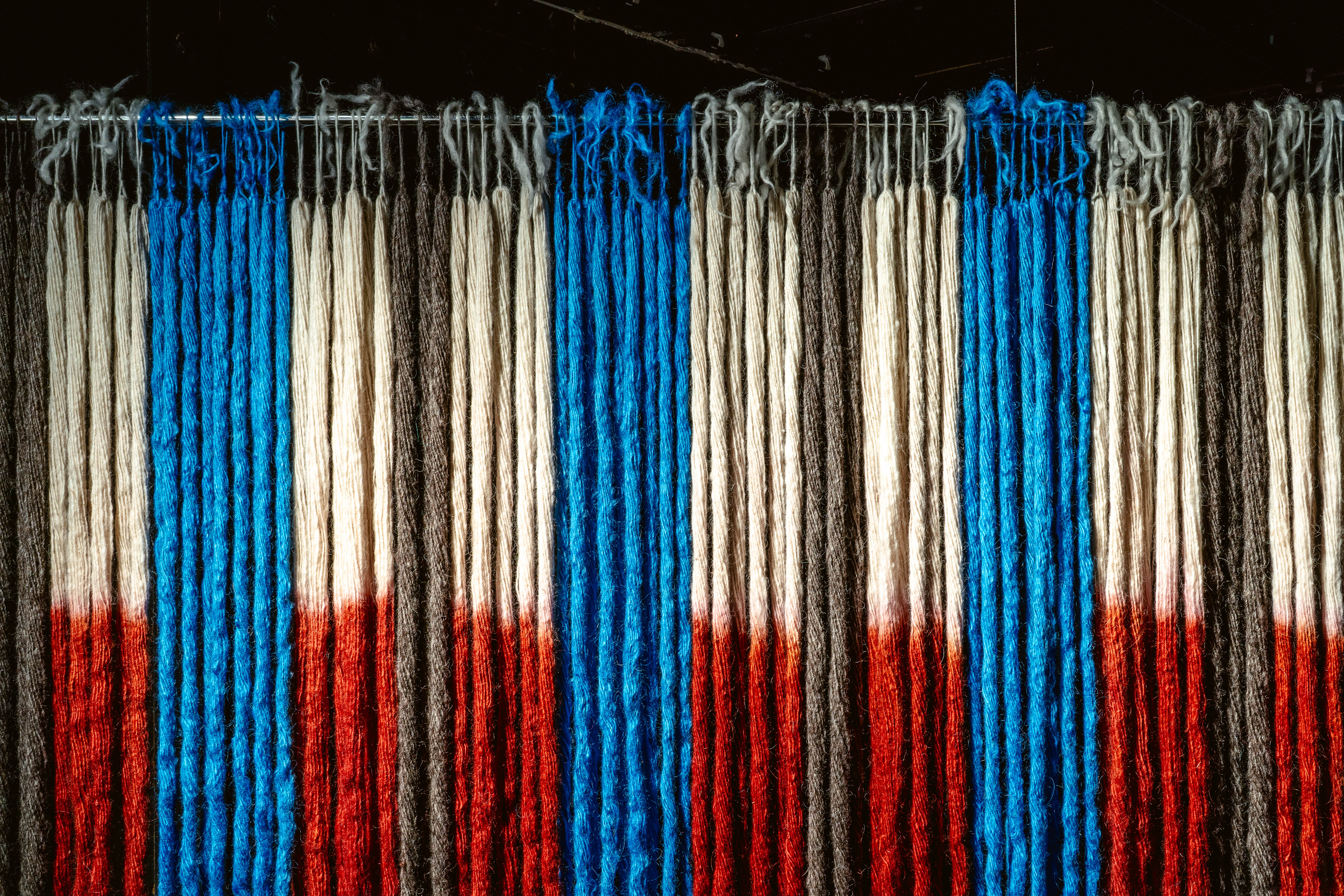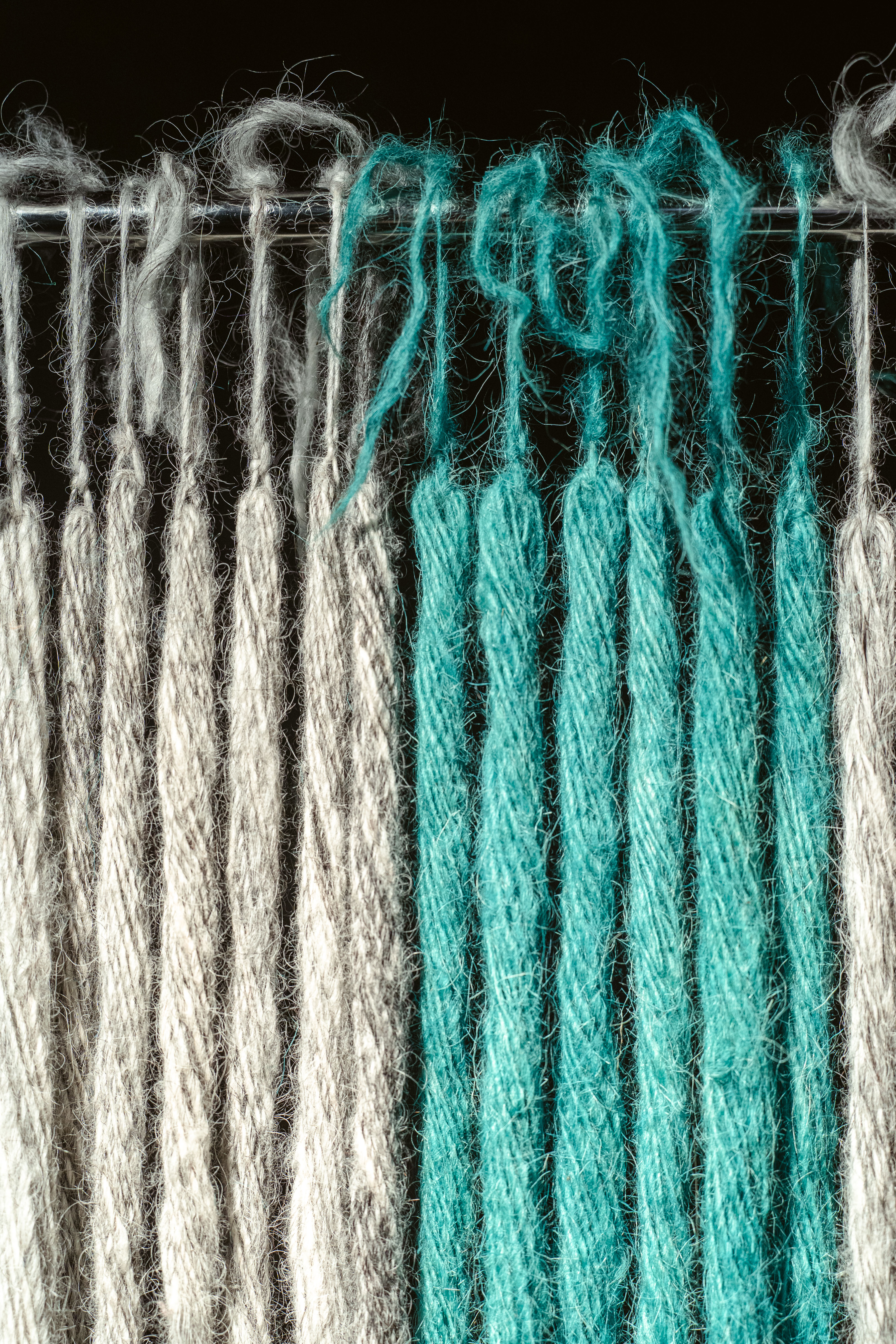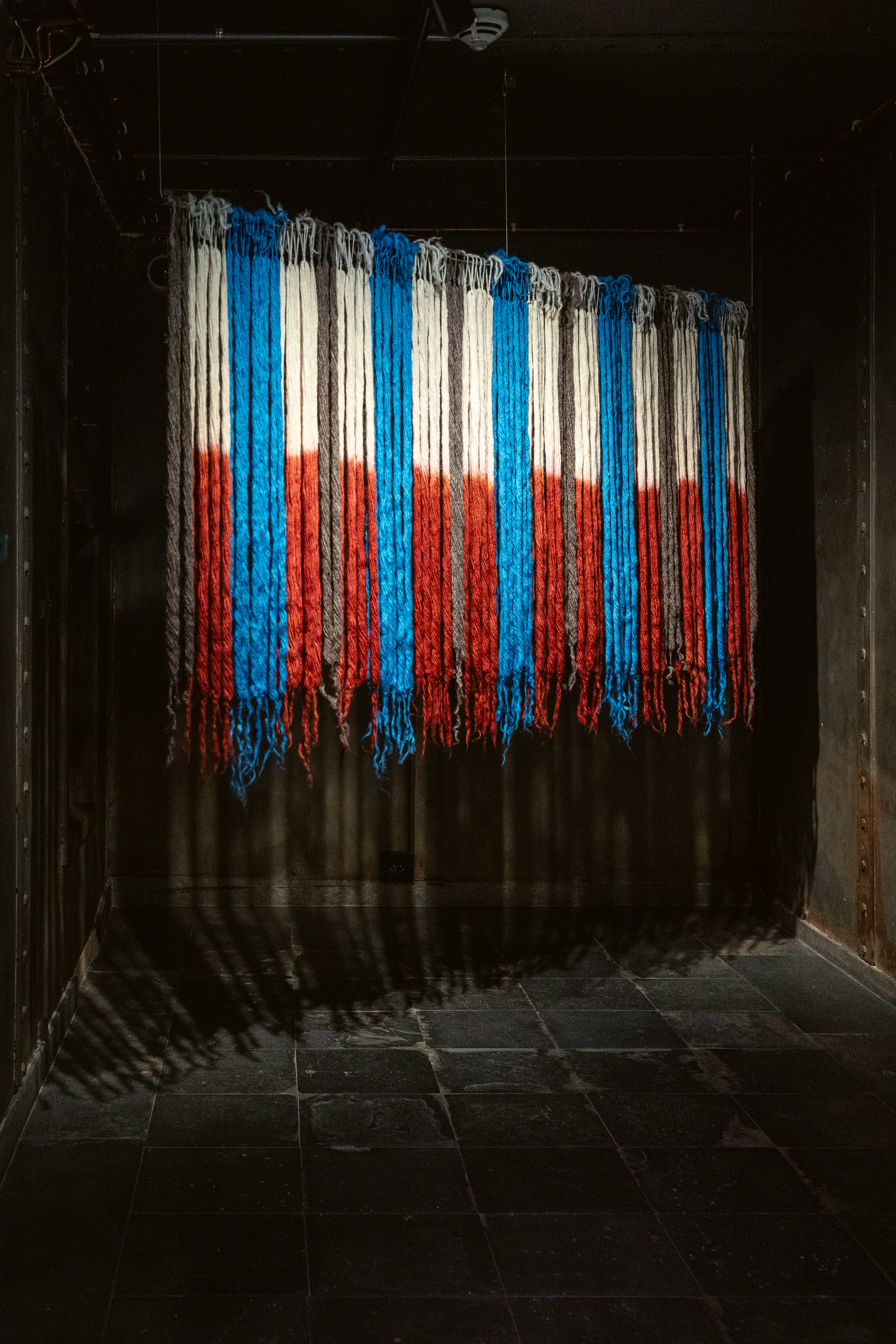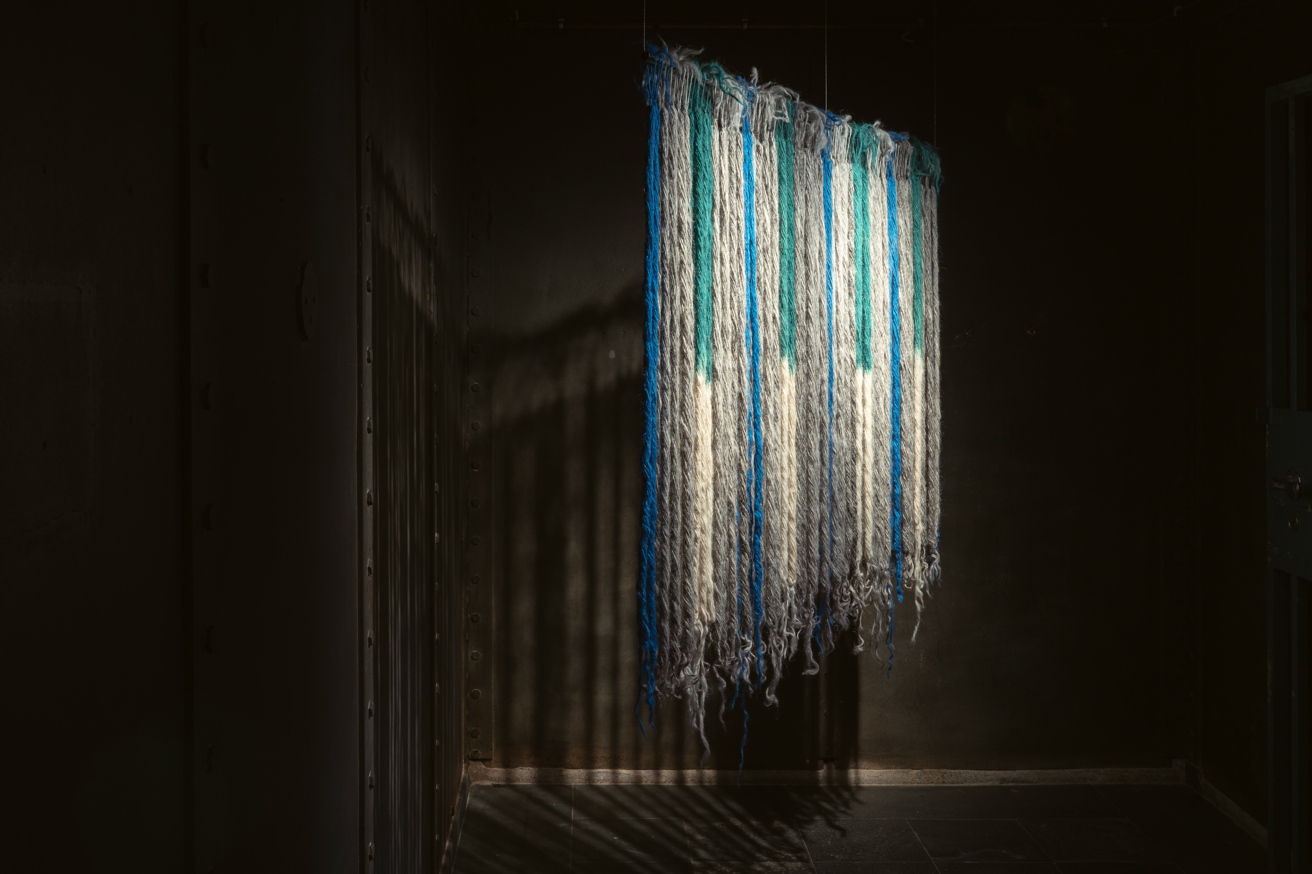 Bildet er tatt i frontalt perspektiv fra innsiden i rom 2. Det meste av billedflaten er mørk, og viser rommets vegger og gulv. Omtrent midt i bildet kan en se det ene verket, som henger litt skråstilt fra venstre side og innover i rommet. Der ser man ulike striper av ull organisert på rekke og rad i en rytme. Dette verket er for det meste farget i blått og grønt, samt sauens naturlige grå og hvite farger. Det er to koboltblå striper til venstre, som avløses av tre grå, deretter to hvor øverste halvdel er grønn og nederste hvit, før den går tilbake til tre grå og deretter til to blå igjen. Denne rytmen gjentas fire ganger. I bunnen av stripene kan en se ullens spenst, der fibrene krøller seg i ulik lengde.