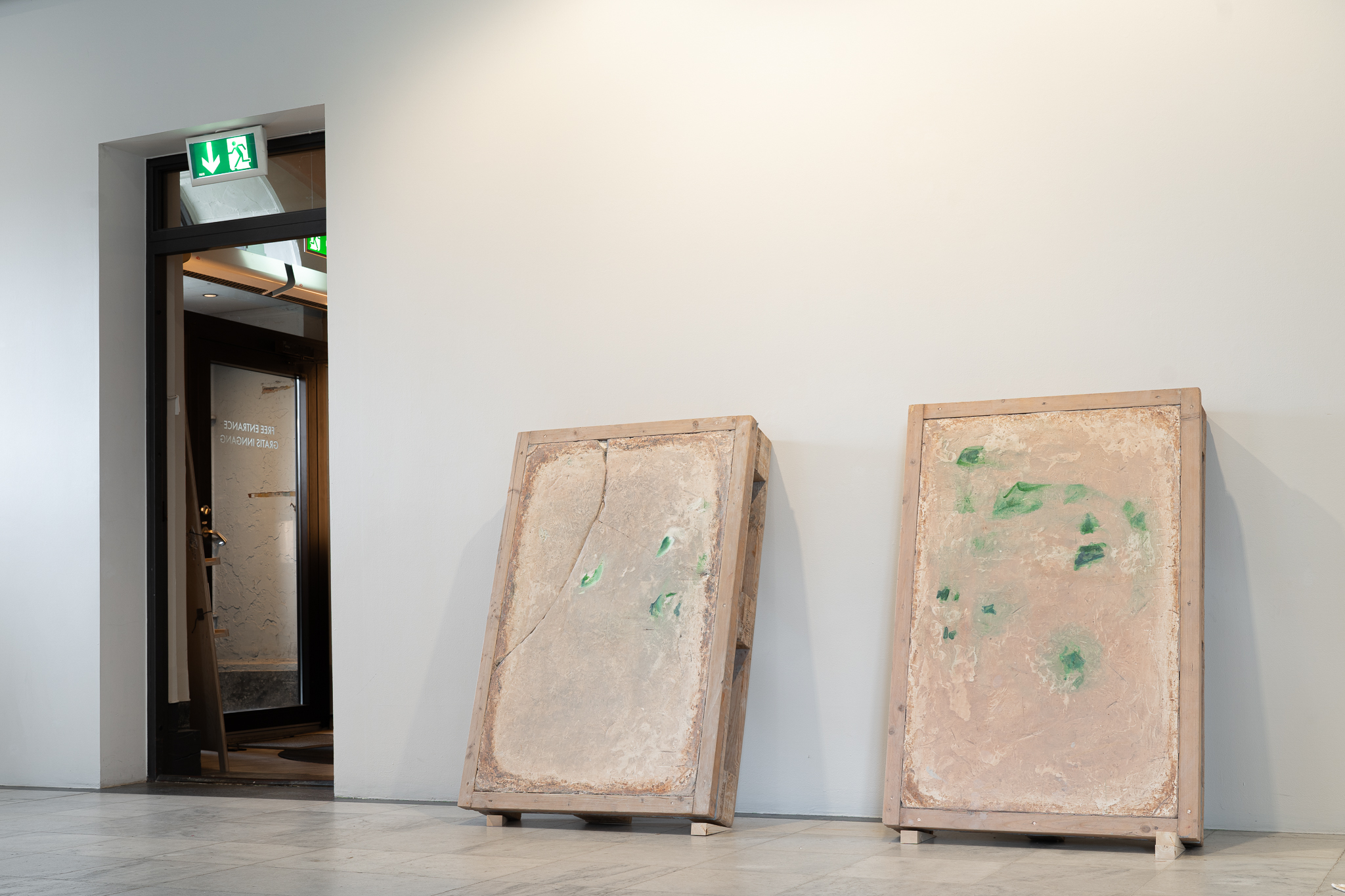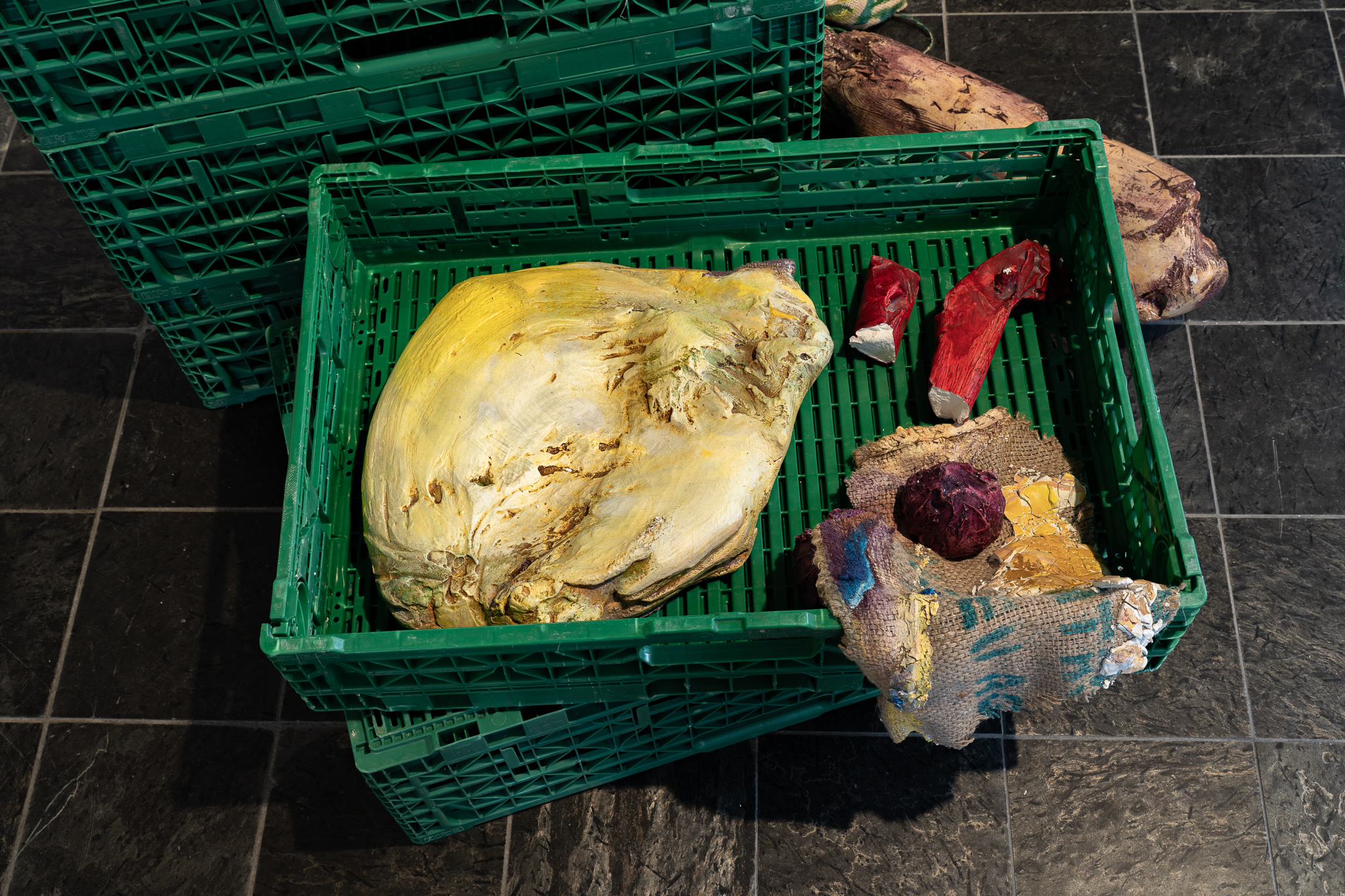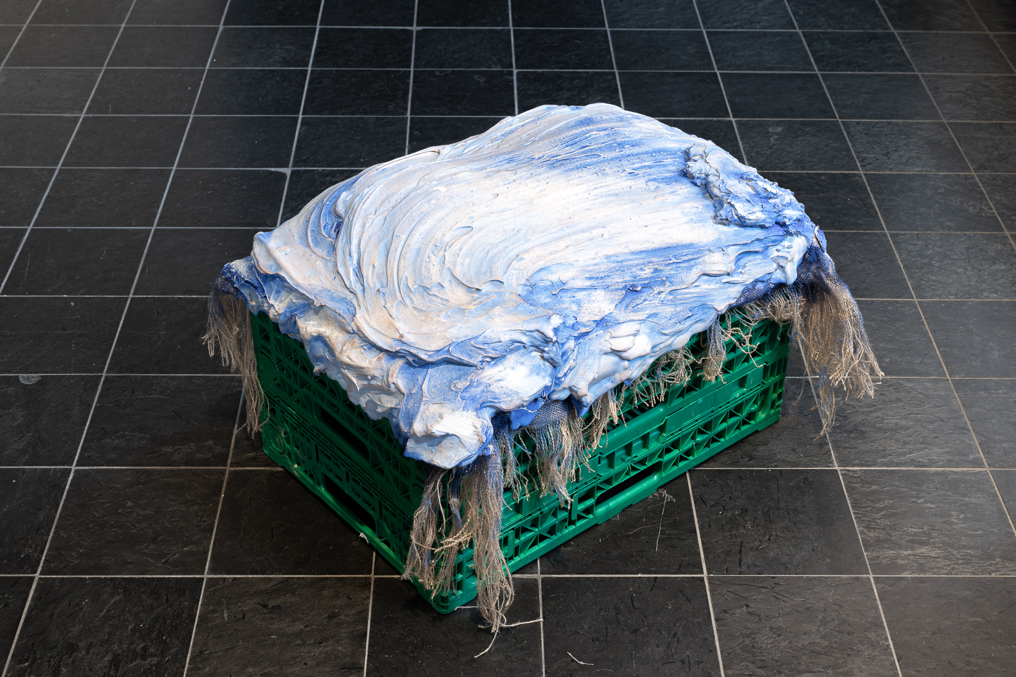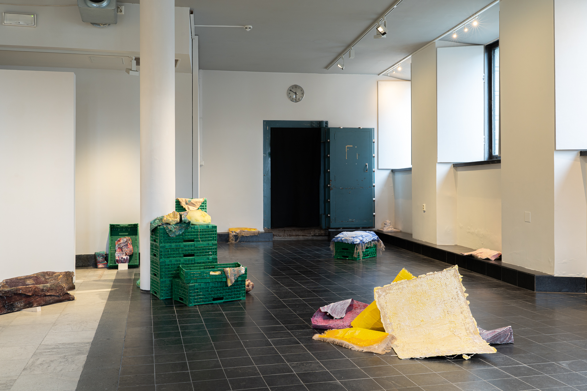 In New Season by Bente Bøyesen, we are invited into an exhibition that balances the new and the unknown with knowledge and experience. For decades, Bøyesen has worked with painting— with organized surfaces of color, composition, tactility, and rhythm. By immersing herself in movement, scent, and texture, she has allowed materiality to lead the way rather than depicting concrete representations. She has remained open to what may come, drawing the painting into space. Bøyesen paints with oil on jute, a natural fiber known to many as burlap when woven. Like hemp, jute is often used to imitate grass and plants—a fitting material history for Bøyesen, who is as engaged in cultivating and experimenting with what grows from the soil as she is in painting. In many ways, the canvas and the soil have much in common: both are surfaces that invite the unexpected to take root, where the good can emerge with the bad, and surprise arises from an apparently controlled chaos. In an effort to bring painting off the wall, Bøyesen experiments with combinations of jute and plaster. The jute reinforces the plaster, enabling sculptural forms and expressions. At the same time, plaster is a demanding material to shape, generous only in the brief moments between being liquid and setting into solid form. Like the earthbound seasons, not all processes allow for lingering – they require openness and presence. The plaster is poured over a curved plate, a form takes shape, a space of possibilities for associations in motion, a new season in which everything simultaneously both is and can become, in which new sounds can resound.