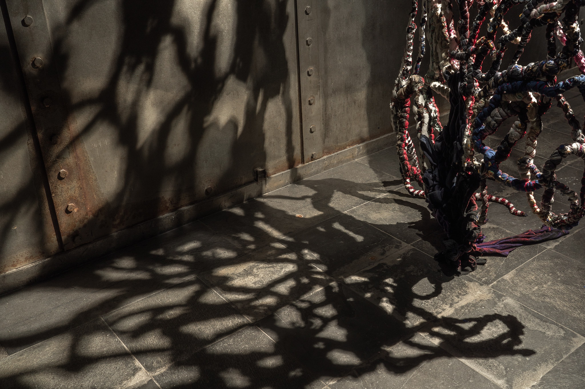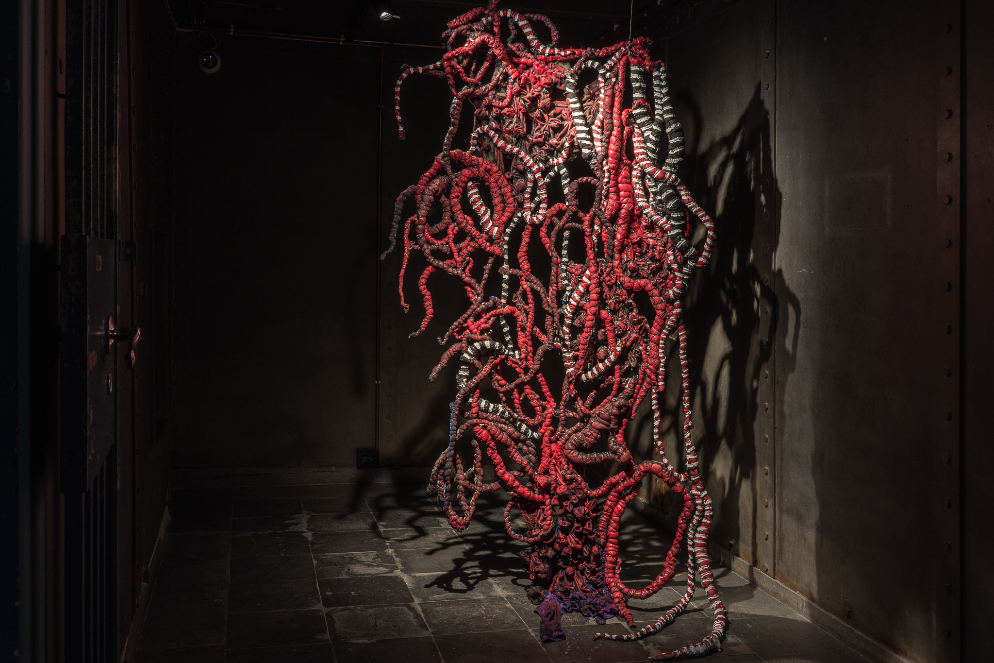In the exhibition Burdened Skins, Sampson Addae explores the crisis and reconciliation of everyday materials. By twisting, squeezing, and stringing together used clothes, he sculpts and transforms them into bodily forms—anonymous figures that emerge and become present. These bodies are then layered with clay and paint, giving them an exterior that binds them together and creates a fat, shiny surface. Mixing garments from people of all ages, backgrounds, and cultures, he blends human traces carried within the textiles, forming an entangled tribe. In Addae’s work, we are all part of both the problem and the solution—common culprits in the crisis. But within this context of brutality and perpetual struggle—living with the consequences of our uncontrolled desires—there is also space to witness and value the labor of our collective efforts. The potential lies in reducing us to our most anonymous elements—liquids and skins—in order to give birth to new shapes, allowing new bodies to emerge.