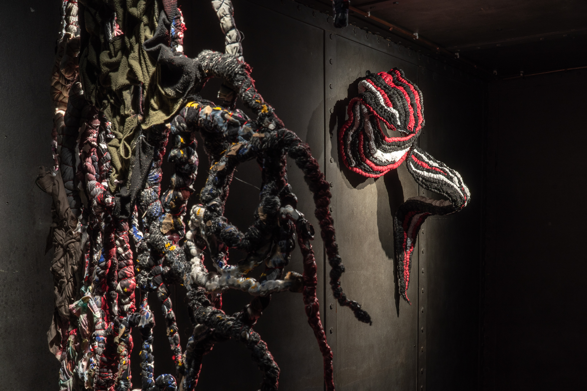 I utstillinga Burdened Skins utforskar Sampson Addae kvardagsmateriala si krise og forsoning. Ved å vri, klemme og binde saman brukte klede, skulpterer og formar han dei til kroppslike former – anonyme figurar som trer fram og får nærvære. Kroppane blir deretter dekte med leire og måling, noko som gjev dei eit ytre som bind dei saman og skapar ei feit, blank overflate. Ved å bruke klede frå menneske i alle aldrar, med ulik bakgrunn og kultur, blandar han spora av menneske som tekstila har bore med seg, og gjer dei om til ein ny, samanfletta menneskestamme. I Addae sine verk er vi alle ein del av både problemet og løysinga – felles skuldige i denne krisa. Men i dette landskapet av brutalitet og vedvarande kamp – der vi lever med konsekvensane av vår ukontrollerte attrå – finst det òg eit rom for å sjå og verdsette arbeidet vår kollektive innsats kan føre med seg. Eit potensial ligg i å blin reduserte til våre mest anonyme delar – væsker og hud – for å kunne gje liv til nye former, la nye kroppar tre fram.