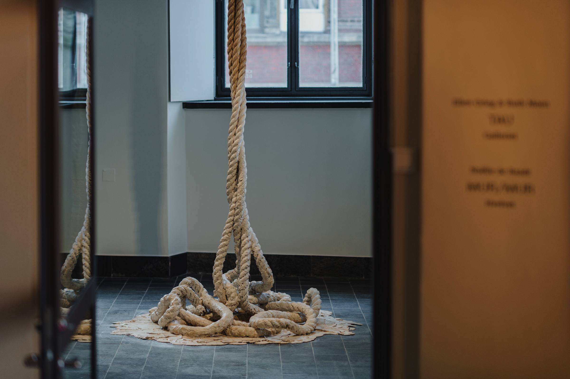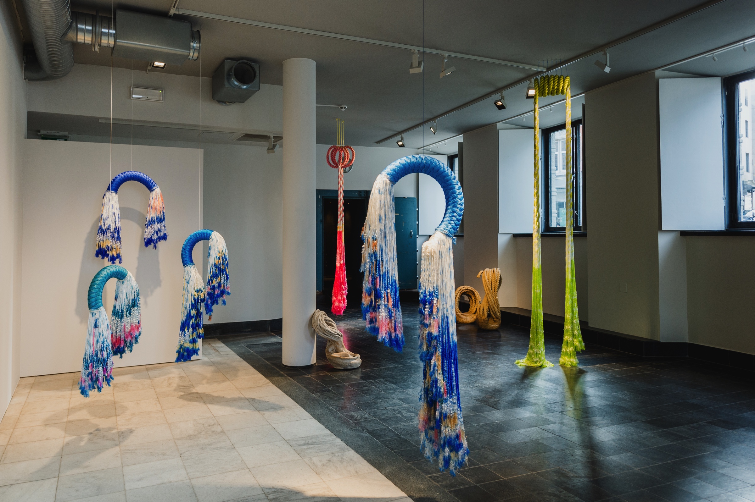 Tau er langt, sterkt og fleksibelt. Det brukes for å binde, holde og løfte. I denne utstillingen benytter begge kunstnerne seg av tau som materiale. Ellen Grieg bruker store nylontau med kraftfulle farger, hengende fra taket som dansende vesener. De går delvis i oppløsning. Ruth Moen bruker naturtau som hun dypper i støpeleire. Begge jobber de monumentalt, i rommet og med rommet. Sammen skaper tauskulpturene en egen dialog.