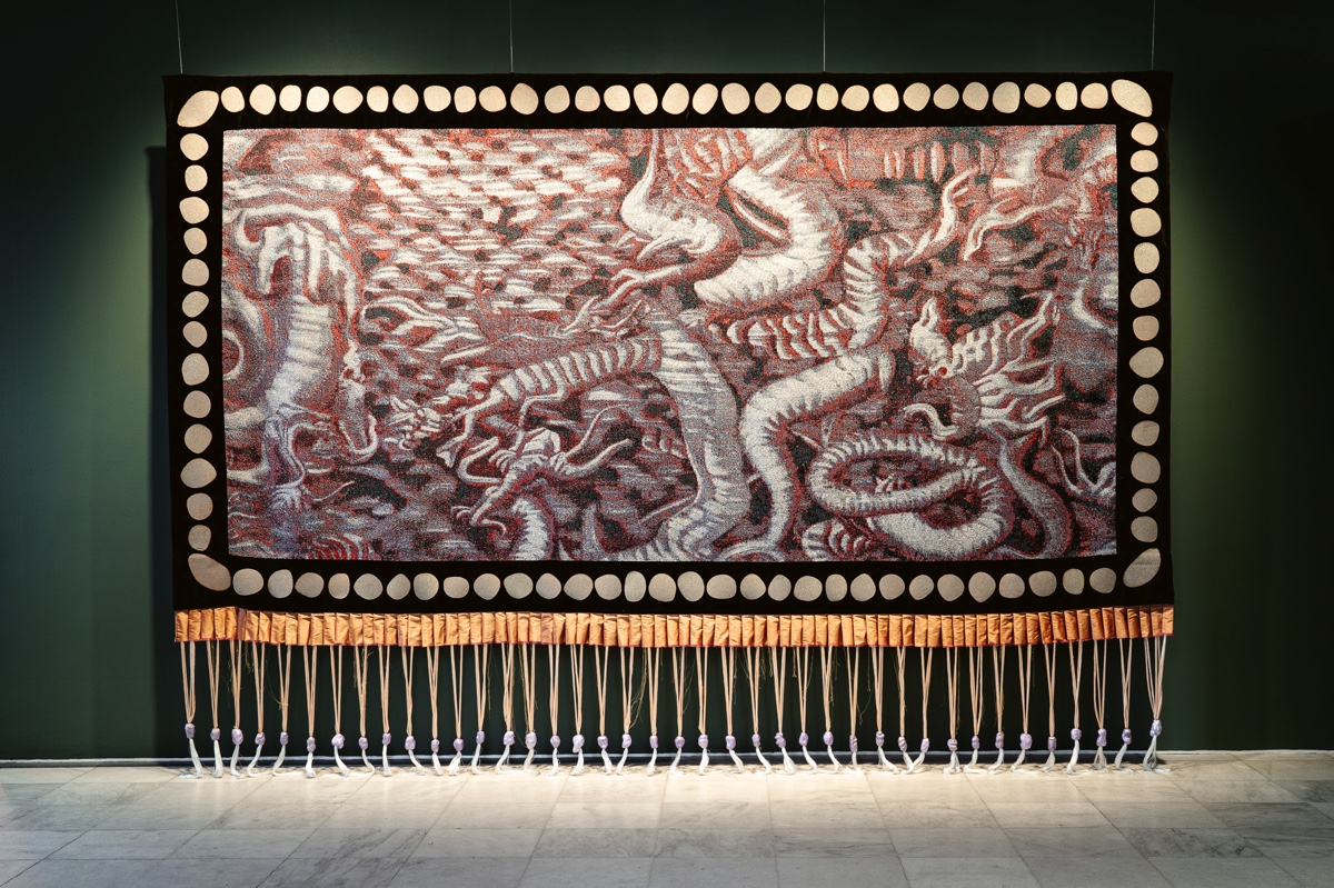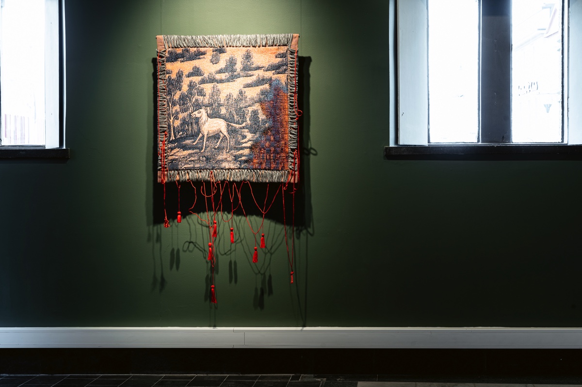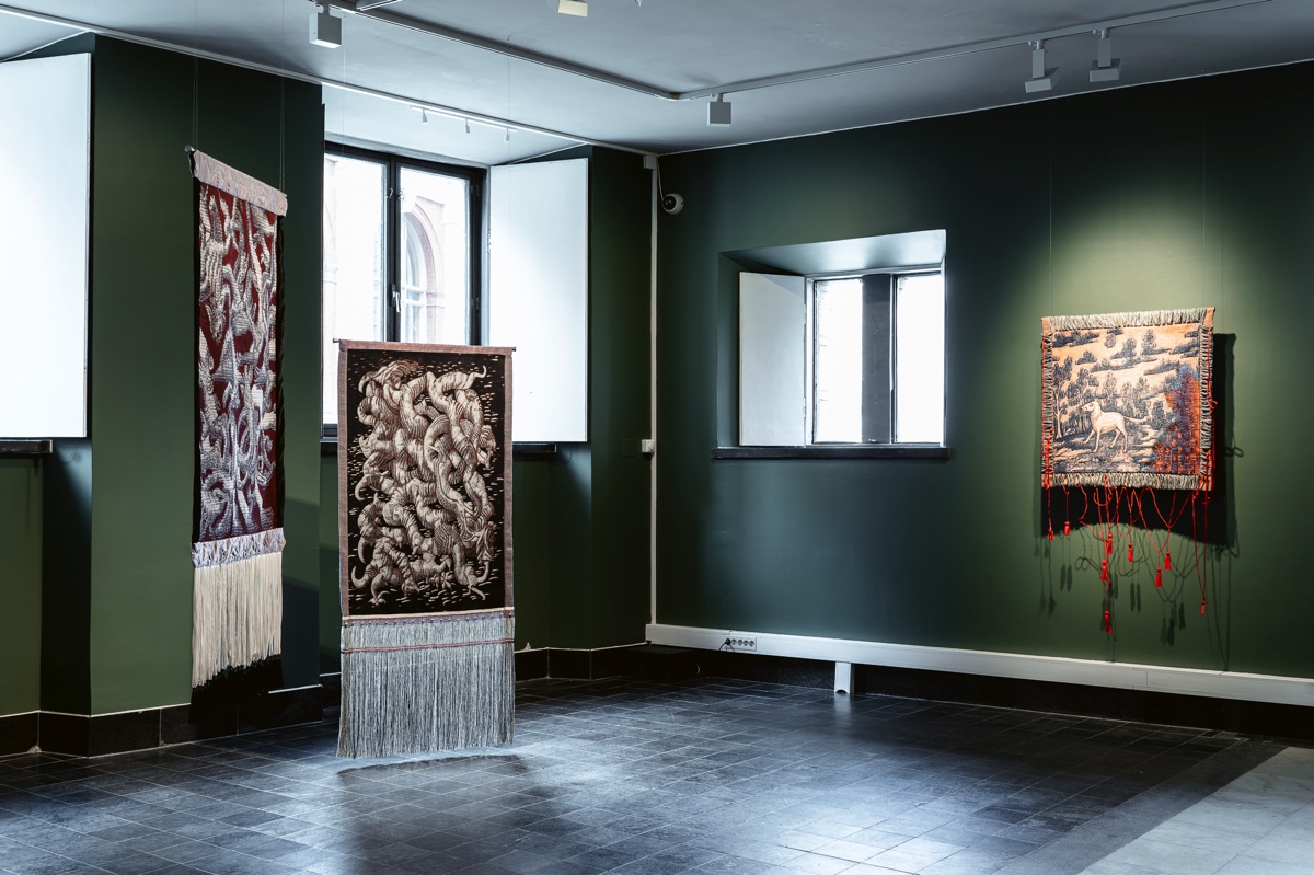 In the 16th century, the Polish-Lithuanian king Sigismund II Augustus collected gobelin tapestries – large weavings often depicting animal motifs, frequently associated with religious stories. At that time, few weavers had seen the animals they were tasked with portraying, forcing them to speculate on their appearance. The freeform results were imaginative, surprising, and magical. Hybrids of different animals were portrayed as if they represented reality, not figments of the weavers’ imagination. The relationship between weaving and technology is another hybrid – data and coding are the binary offspring of warp and weft. In Hybrid II, Kristina Austi has drawn inspiration from tapestries and fed them into an artificial intelligence model along with examples of her own weavings. Free from worldly considerations and limitations, the artificial intelligence absorbs the information and generates wild suggestions for new hybrids and combinations, drawing connections between Austi and the speciously diverse speculations of the 16th century weavers. Digital brains lack a hand’s tactility. They can conjure up adventurous visions but cannot feel the inherent quality of the thread, nor the sensuous aspects of the textile. The human hand remains the most dangerous weapon and the most beautiful tool. Austi’s hand unravels artificial intelligence’s boundless world of ideas and translates it back into her own practice in the form of large, digital tapestries. These depict universes detached from the logic of the world, where fearsome wolves bite their own tails, limbs and body parts changing wildly. The fabric’s structure becomes landscapes and cities, mythological creatures dissolve into horizons of clouds and waves. A hand reaches out and grasps around the wonder of the past and the clarity of the future, weaving them together and binding them tightly, giving birth to new generations of hybrids at the intersection of human and machine, past and future, textile and technology.