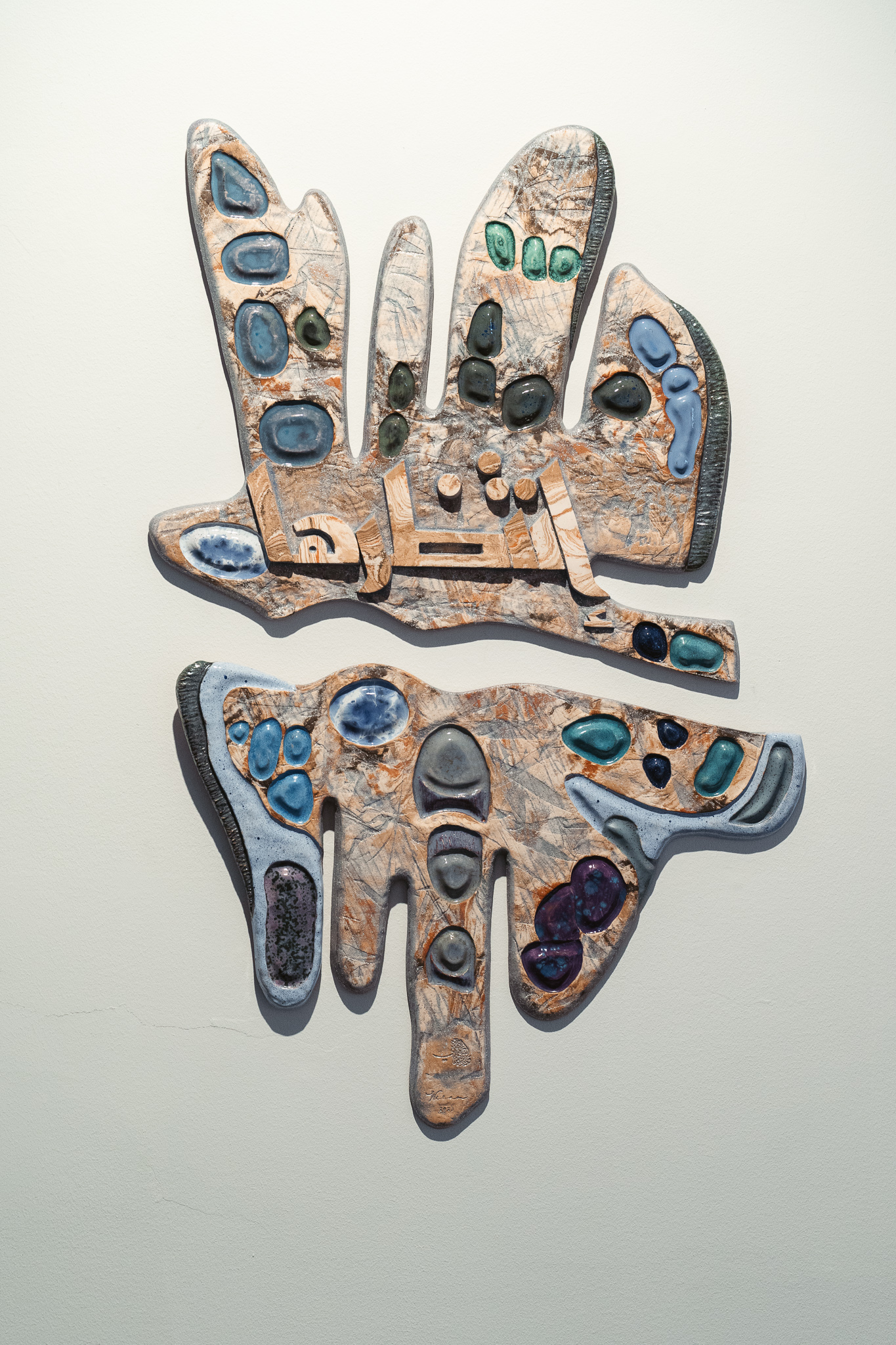 In A Light from Mesopotamia, love is central. Wisam Al-Samad gives it shape in ceramic works, the material itself being his great love. Drawing inspiration from Kufic script (an Arabic script known from the oldest handwritten manuscripts of the Quran) and the cultural meeting between the Nordic and Middle Eastern regions, the exhibition space is filled with a large number of ceramic works where form and color meet in a tribute to primal forces. With an unabashed openness to the greatest of human emotions, Al-Samad has created a series of works that play on the meeting of contrasts. Contrasts between the harsh edges of the Kufic script and the soft, organic clay, between cold and warm colors, between small components and large wholes. The Arabic language is rich in meanings and synonyms, and in each of the works, a synonym for love is combined with motifs from the Middle East and parts of Norwegian rock carvings. The Mesopotamian empire, which included present-day Iraq, was a fertile area housing some of the oldest settlements we know of. It was here that cuneiform script originated, one of the oldest known writing forms, where wedges, angles and lines were pressed into tablets made of clay. Wedges, angles and lines also characterize Nordic rock carvings, and Al-Samad thus opens up for aesthetic connections between material and expression that extend across time, culture, and borders – not unlike the universal language of love.