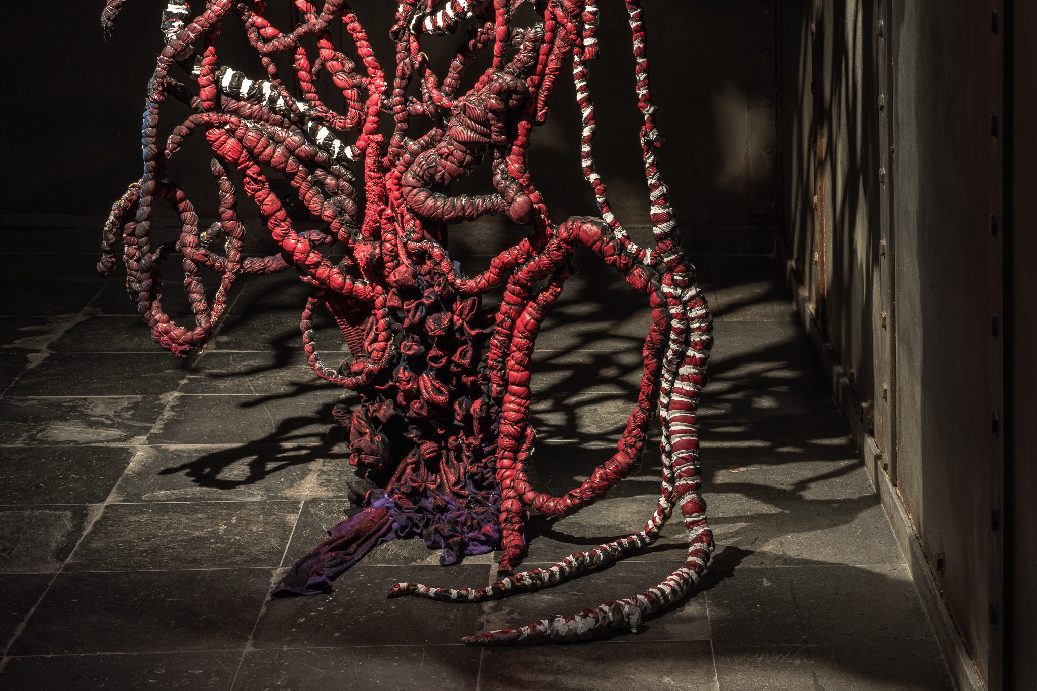 In the exhibition Burdened Skins, Sampson Addae explores the crisis and reconciliation of everyday materials. By twisting, squeezing, and stringing together used clothes, he sculpts and transforms them into bodily forms—anonymous figures that emerge and become present. These bodies are then layered with clay and paint, giving them an exterior that binds them together and creates a fat, shiny surface. Mixing garments from people of all ages, backgrounds, and cultures, he blends human traces carried within the textiles, forming an entangled tribe. In Addae’s work, we are all part of both the problem and the solution—common culprits in the crisis. But within this context of brutality and perpetual struggle—living with the consequences of our uncontrolled desires—there is also space to witness and value the labor of our collective efforts. The potential lies in reducing us to our most anonymous elements—liquids and skins—in order to give birth to new shapes, allowing new bodies to emerge.